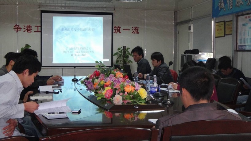 2012年3月25日,在項(xiàng)目經(jīng)理的推動及項(xiàng)目部全體人員通力配合下,項(xiàng)目部利用大風(fēng)惡劣天氣無法施工的間隙,開展了船舶船員安全知識及技能暨“5S目視化管理”的專題培訓(xùn)。主要的培訓(xùn)內(nèi)容有:1、船舶個人安全及社會責(zé)任;2、船舶防火與滅火;